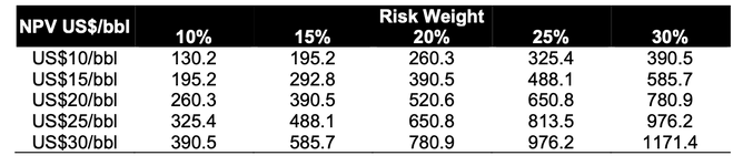 CUBA Block 9 PSC Project Valuation: using various Brent prices & Risk Weights.
