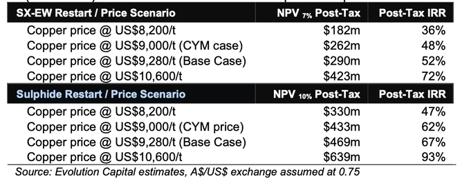 Nifty Valuation: We have first modelled the Nifty project in line with the Restart Study parameters to check the model’s validity, then run three different copper price scenarios including a slightly higher copper price for the Base Case at $9,280/t compared to $9,000/t for the Restart Study. The Sulphide Restart is based on the Scoping Study results released by Metals X Ltd (ASX: MLX) in June 2020 with increased capex and opex.