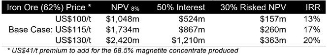 Razorback Financial Modelling: we modelled the development and operation of the project in line with Base Case (5 Mtpa) and Expansion Option (5 to 10 Mtpa), then used different iron ore prices.